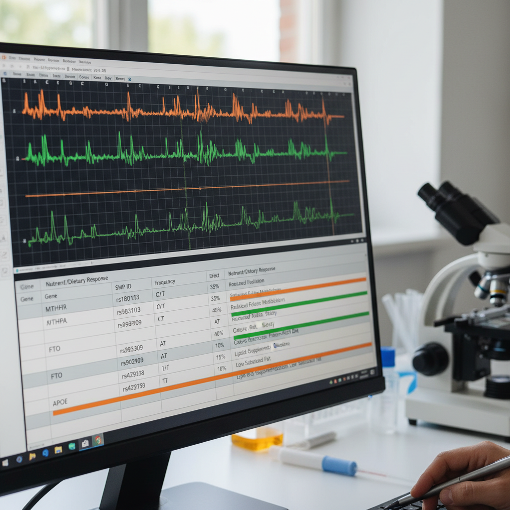 A nutrigenomic panel typically analyses 50–100 SNPs across pathways including methylation (MTHFR, MTR, MTRR), detoxification (GSTP1, CYP1A2), inflammation (IL-6, TNF-α, COX-2), lipid metabolism (APOE, APOC3, LPL), and vitamin metabolism (VDR, GC, DHCR7). Results guide personalised supplementation protocols — for example, MTHFR C677T homozygotes require methylfolate (not folic acid) and methylcobalamin (not cyanocobalamin).